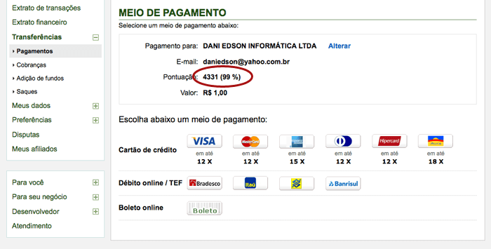 Depois você entra na sua própria conta do pagseguro e faz uma simulação de transferência para o email que você anotou. O resultado que vai ver na tela é precisamente a quantidade de vendas que o autor fez e a pontuação.
